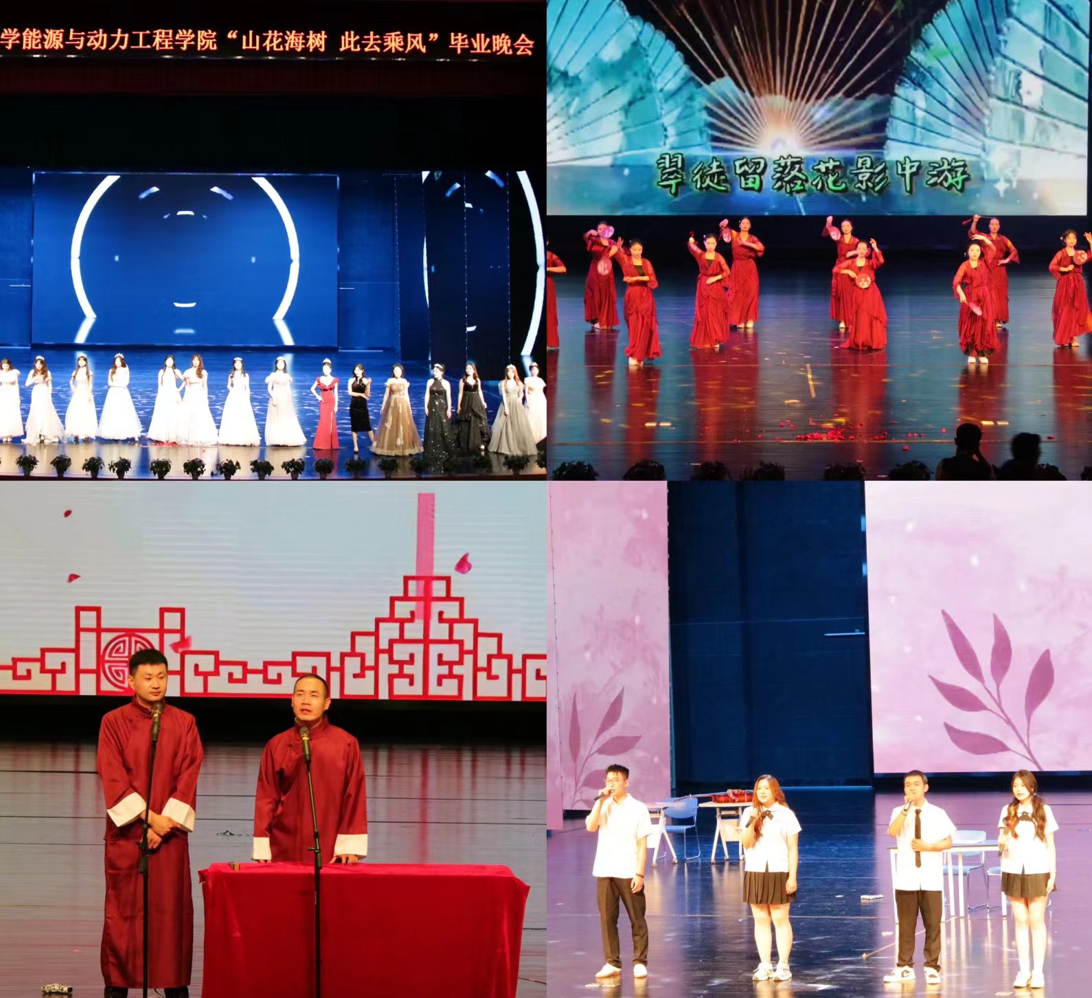 五彩斑斓的灯光交织成一幅绚烂的画卷,悠扬动听的旋律在剧场中回荡。一曲古筝伴唱《孤城》带领老师同学们感受离别的惆怅与重逢的期盼;一段《芒种》的古典舞赢得满堂喝彩;一首《凤凰花开的路口》轻轻响起,优美的旋律和深情的歌词,诉说着一个个关于青春、关于成长的故事;“就在启程的时刻,让我为你唱首歌”,所有参演人员为我们带来了合唱歌曲《启程》,在悠扬的歌声中,2024届毕业生们也将再次启程奔向无穷的远方。热情的歌声回荡在礼堂,却难掩毕业的离愁;优美的舞姿跃动在舞台,却道不尽对母校的深情。